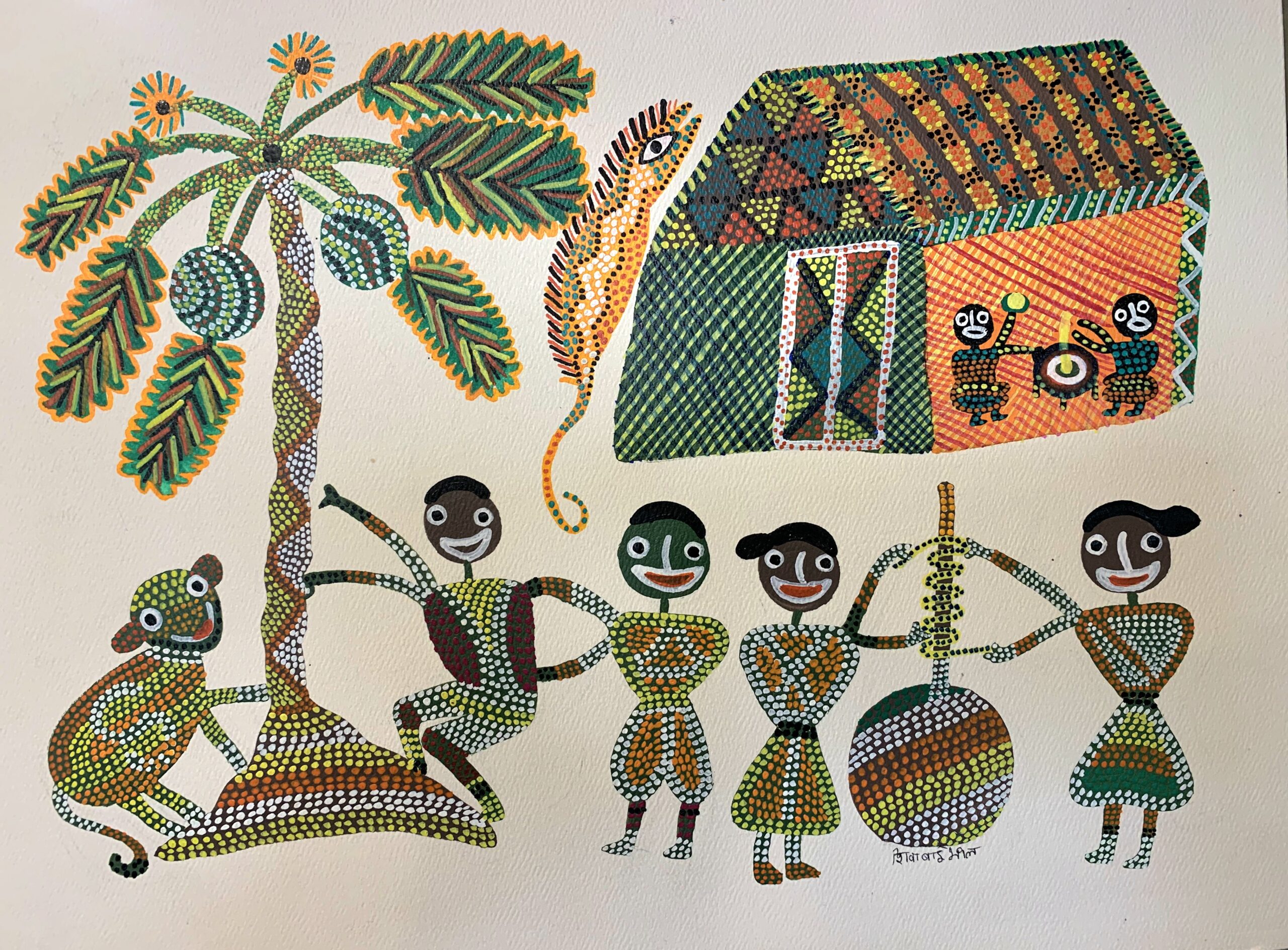 Bhil Art is one of the most vibrant yet uniquely expressive folk art forms originating in central India. Traditionally, this art was done on mud walls and floors with rice paste and natural pigments. Today, it is also painted on canvas and paper. The Bhils are very spiritual people and believe in the sanctity of Mother Nature. They are mostly dependent on forest resources for their livelihood and possess a spiritual connection with their environment.